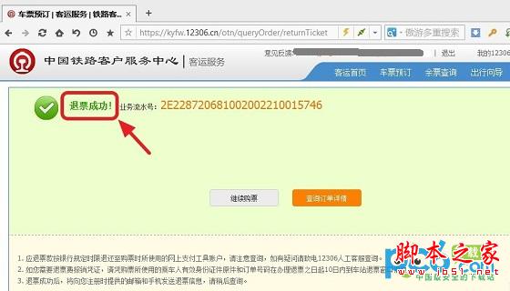 五、最后我们即可看到退票成功的提示,如下图所示: