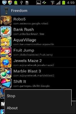 2、如果卸载失败,请在安卓内购插件Freedom里面选择【STOP】,然后卸载,不然只能重新安装Freedom而不能正常使用谷歌play市场;