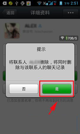 3)最后点击“删除”,然后会收到一条微信发来的提示语,点击“是”,那么现在该微信好友就彻底消失在你的微信了。(如下图所示)