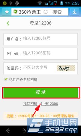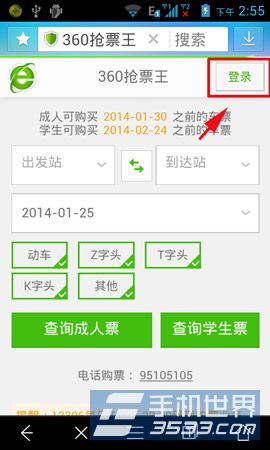 1)首先下载并安装360手机抢票神器,然后点击首页的“360抢票王”,点击右上角的登录,登录你的“12306”帐号。