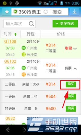 3)点击购买后,找到你要的班次和席别,点击“购买”。