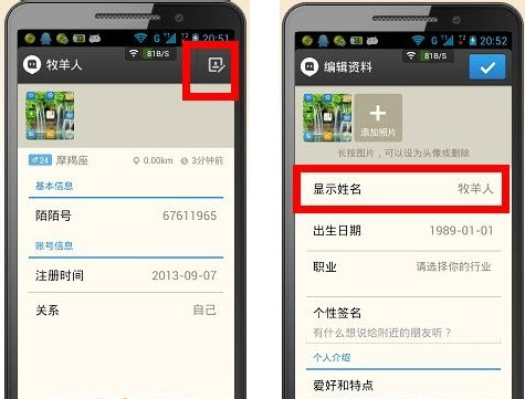 2、点击右上角的修改资料,然后找到并打开显示姓名。