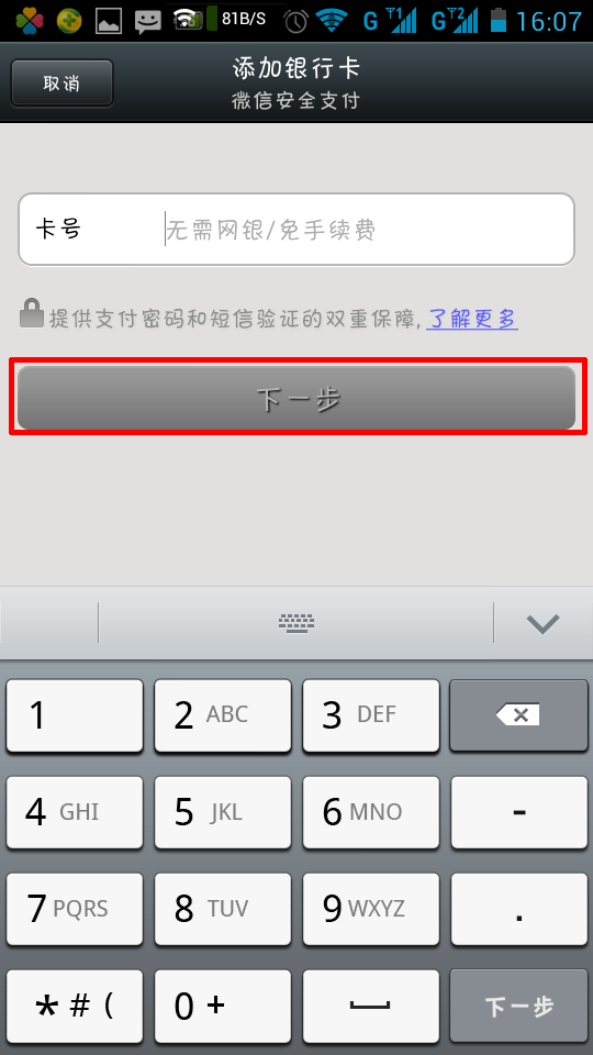 单击之后会出现如图所示,这时我们将自己的银行卡输入进去,然后单击“下一步”按钮。