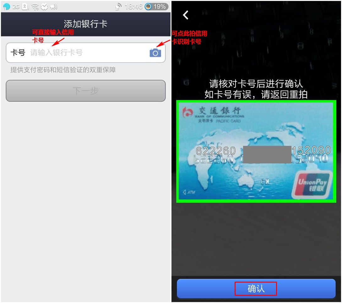 2、用户可手动输入银行卡号,也可以点击右上方蓝色相机图标,通过手机拍银行卡正面的方式识别银行卡号,(仅支持大陆发行的个人类型信用卡);