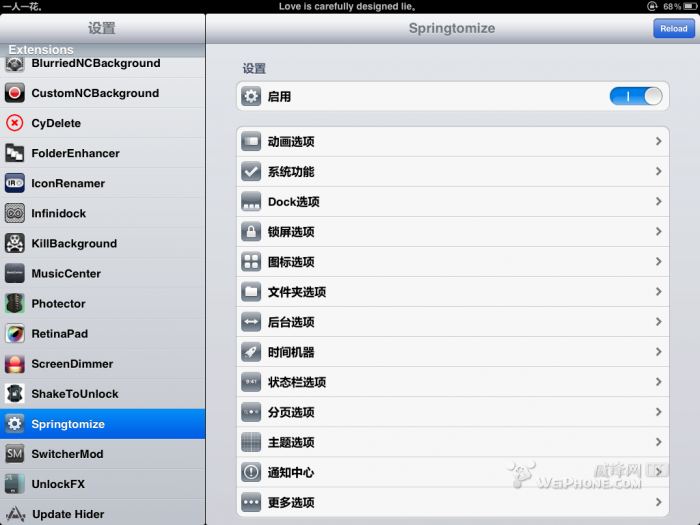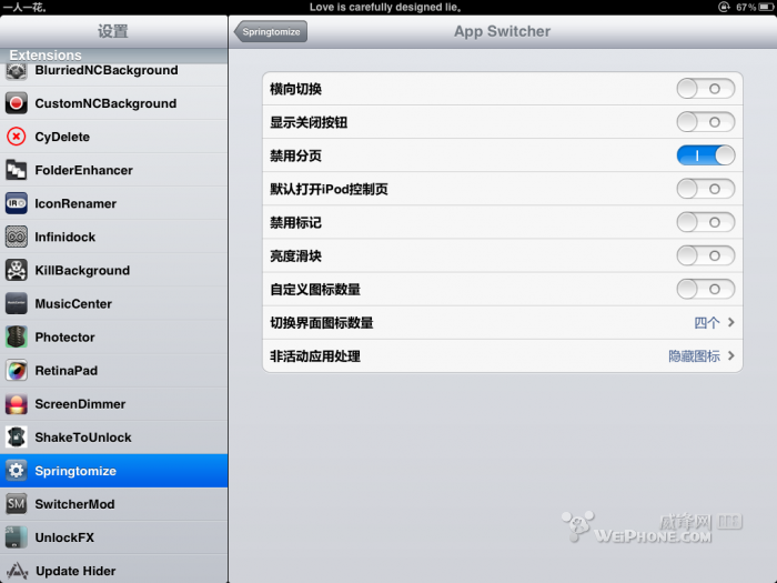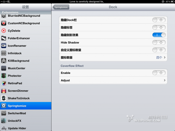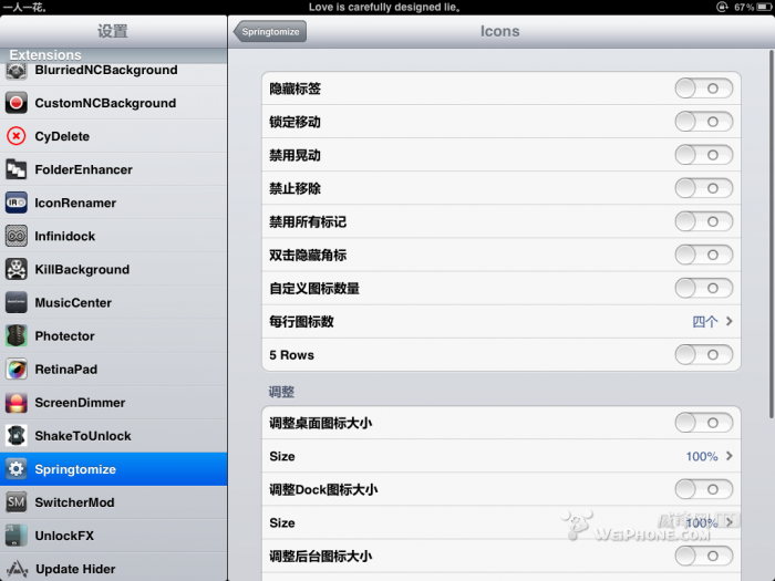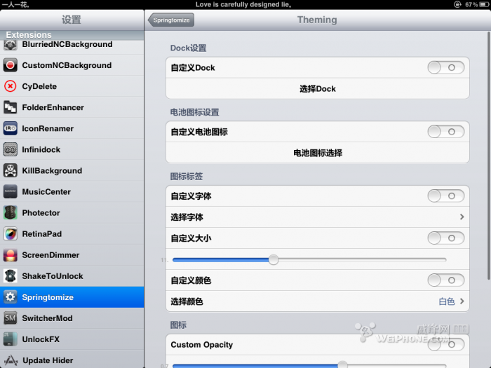 这里的功能就多了,可以调整图标的大小以及后台图标的大小,就介绍下,截图里没有截到的几个功能,那就是隐藏报刊杂志应用,以及hide springtomize 启用按钮,可以自定义选择需要隐藏的程序图标