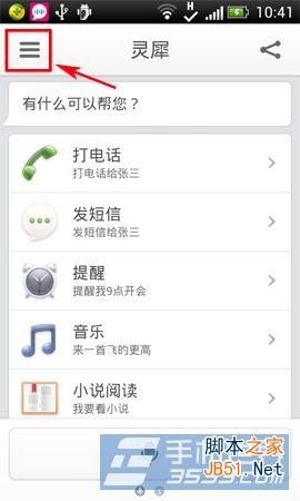 1)首先打开灵犀语音助手,进入首页,点击“三横”按键。