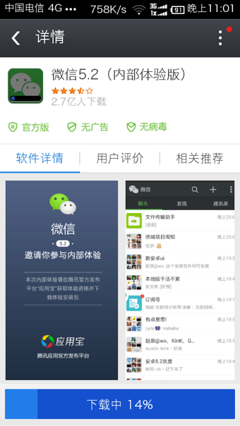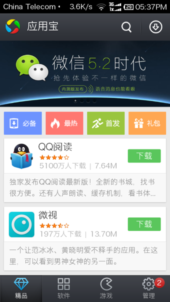 打开应用宝软件,可以看到上面有一个微信5.2的横幅。