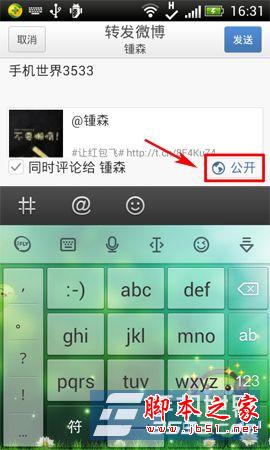 2)在进入转发微博界面,点击“公开”按键,然后在按“发送”按键。(如下图所示)