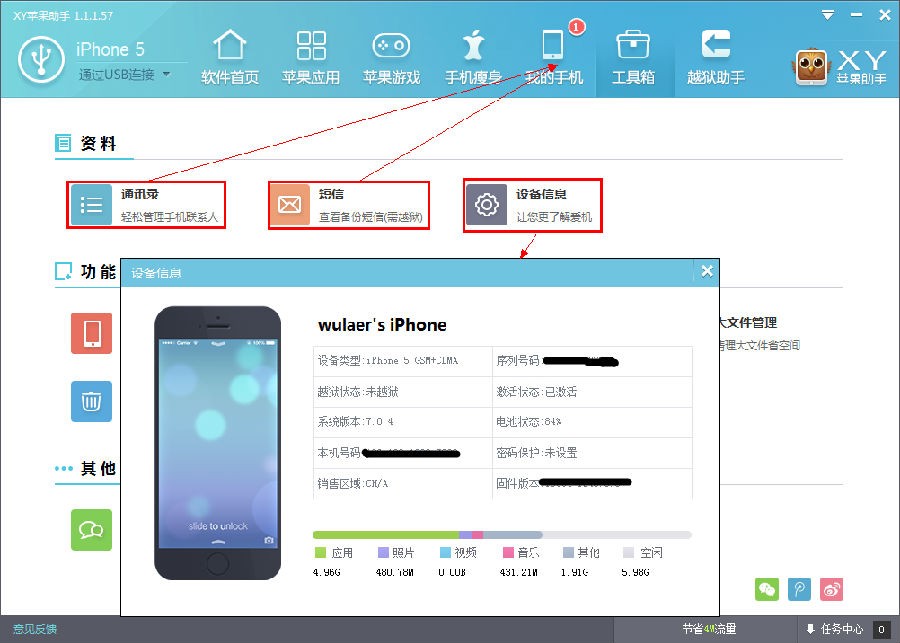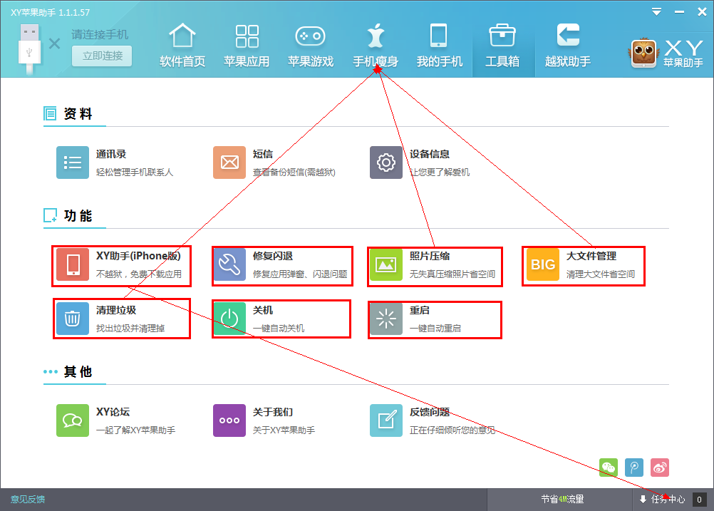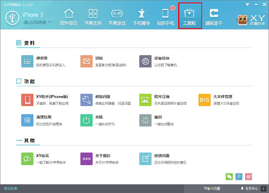 XY苹果助手的工具箱页面分为:资料,功能,其他三部分。资料中包含:通讯录,短信,设备信息。功能中包括:XY苹果助手,修复闪退,照片压缩,大文件清理,清理垃圾,关机,重启。其他中包括:XY苹果助手论坛,关于我们,反馈问题。由此看来,XY苹果助手的工具箱页面更像是一个导航页面,为用户提供所需功能的指引。下面就为大家详细介绍一下这些按钮的具体功能。