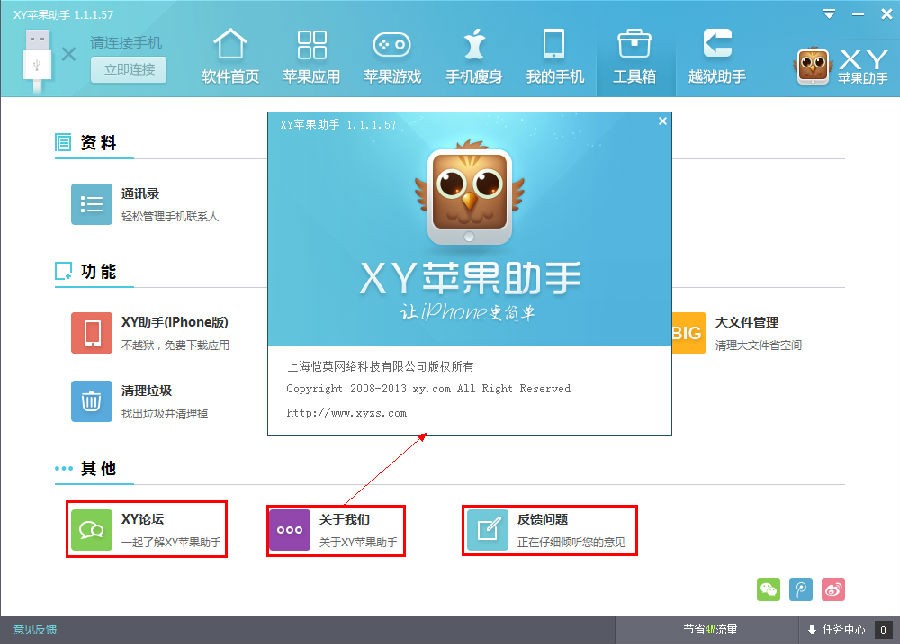 3.点击“XY苹果助手论坛”按钮,会跳转到XY苹果助手论坛(http://bbs.xyzs.com/),点击“关于我们”按钮,会弹出XY苹果助手的详细信息对话框。点击“反馈问题”按钮,会跳转到XY手机助手网站的“问题反馈”(http://www.xyzs.com/feedback),可以在这里反馈您遇到的问题,我们会尽快处理并给您回复的。