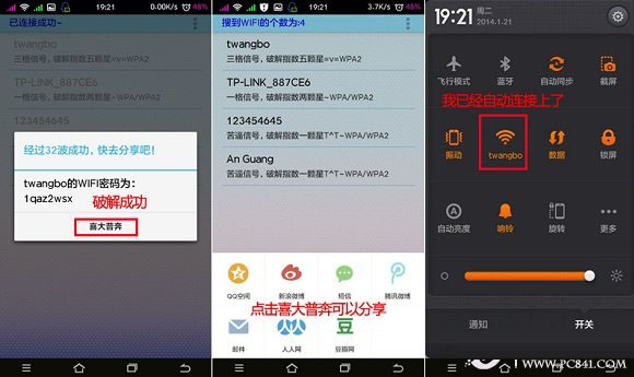 4、如果破解成功的话,就会自动连接上Wifi无线网络,并且会弹出密码,我们可以分享给身边的朋友,不过此为蹭网,建议尽量不要告诉他人,另外也不要进行一些看电影或者长时间的下载东西操作,以免影响他人上网。