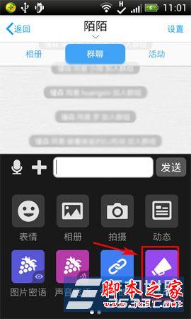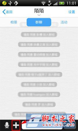 2)进入该群组,点击“+”按键,然后在显示出的功能界面中按“活动”按键。(如下图所示)