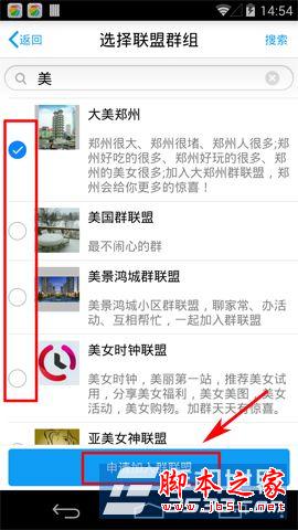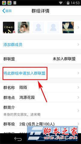 2)在进入群组详情界面,点击“将此群组申请加入群联盟”按键,然后在选择联盟群组界面,选择好联盟的群后,再按“申请加入群联盟”按键即可。(如下图所示)
