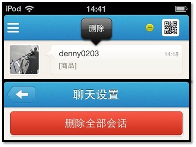 1、删除和某个人的会话,进入旺旺会话列表页,长按某个对话,点击出现的“删除“按钮,即可。