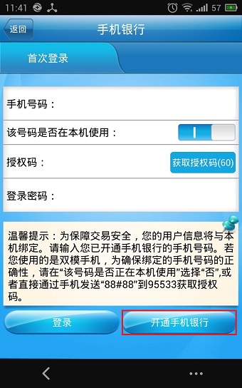5、点击“开通手机银行”,然后按步骤填写进行开通即可。