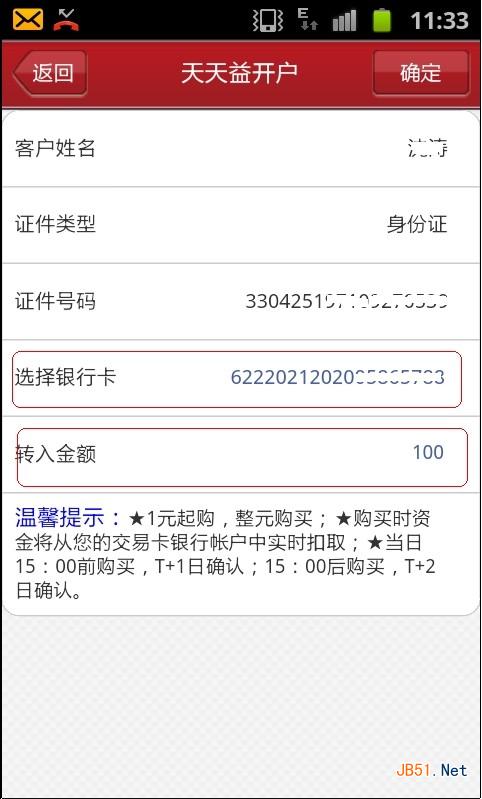 3、选择已注册手机银行的借记卡,输入“购买金额”,点击右上角【确定】。