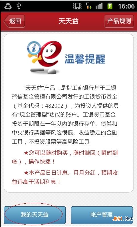 1、高收益、低风险。“天天益”实质上是一款创新型货币基金,日日计息、月月分红,借助工银瑞信强大的投资团队,将活期资金投向短期银行存单、债券和中央银行票据等低风险、稳定收益的金融票据,不涉及股票等高风险领域,最近一周的年化收益高达5.955%。