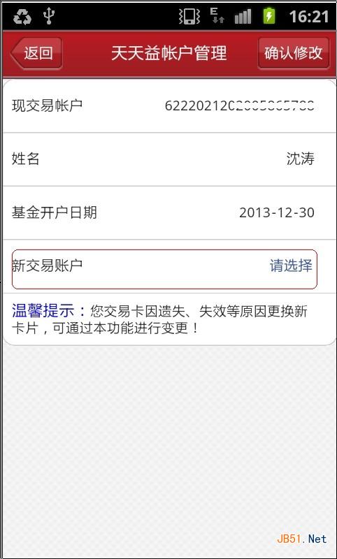 2、选择已注册手机银行新的借记卡,点击【确认修改】