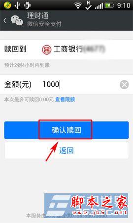 3)在进入理财通界面,点击“赎回”按键,最后在赎回界面中输入金额后,按“确定赎回”按键即可。(如下图所示)