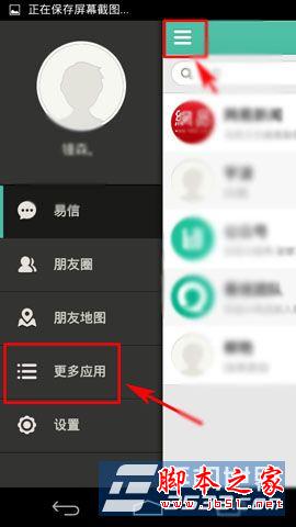 1)首先打开易信,进入首页,点击“三横”按键,在进入功能界面后,按“更多应用”按键。(如下图所示)