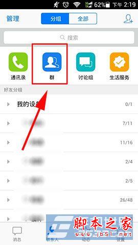 1)首先打开“手机QQ”然后在联系人中的“群”点击一下。(如下图所示)