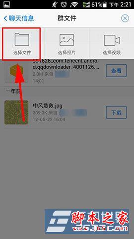 4)选择上传的类型,然后点击进去,选择需要上传的内容,在右下角的“上传”点击一下,就可以向群里的好友分享文件或者视频了。(如下图所示)