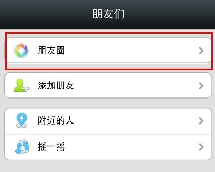 2、在这一界面中选择第一项“朋友圈”进入朋友圈界面,在此界面中你可以查看好友动态,也可以发表自己的动态。