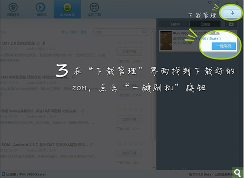 第三步:选择好对应的rom包后,等待rom包下载好,在下载管理界面中找到下载好的rom包,点击一键刷机按钮(如下图),其中你可以选择勾选或者不勾选清除数据或者备份,进入自动刷机状态。