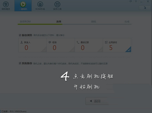 第四步:点击刷机按钮,开始刷机(请确保你的机子已经放置内存卡并且有足够的剩余空间)如下图