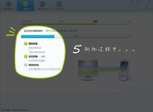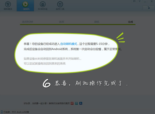 第六步:接下来设备进入自动刷机模式,需要5-15分钟,耐心等待一会儿,这个是根据手机的性能来决定的,刷机完成后提示成功,界面如下图所示: