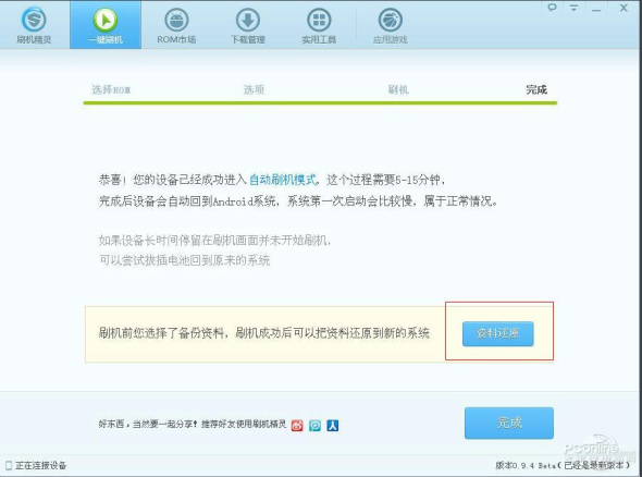 第七步大于5-15分钟过后(视乎手机的配置和刷机包大小来决定时间长短,小编手机大概3分钟即可),刷机完成后,点击刷机精灵的“资料还原”。