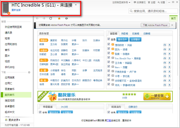 第一步:安装好豌豆荚之后,连接手机,确保手机已经开启USB调试