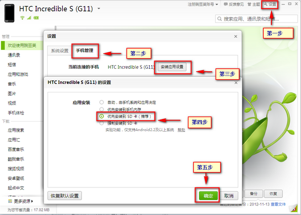 第三步:在手机连接成功之后,就可以在设置里面对习惯使用进行设置。下面就软件怎么安装至SD卡中进行设置。