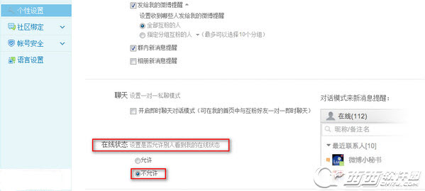 看到“个性设置”中的“在线状态”(设置是否允许别人看到我的在线状态),我们选择“不允许”: