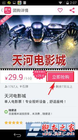 1)首先打开百度糯米软件,进入首页,点击团购列表中的一个团购物品,在进入该物品团购详情界面后,按“立即抢购”按键。(如下图所示)