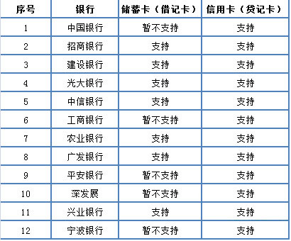 中国银行、招商银行、建设银行、光大银行、中信银行、工商银行、农业银行、广发银行、平安银行、深发展、兴业银行、宁波银行,具体是储蓄卡还是信用卡请看下图。