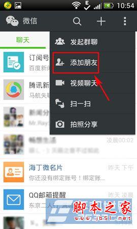 1)首先打开微信,进入首页,点击“三点”按键,然后在显示出功能列表中按“添加朋友”按键。(如下图所示)