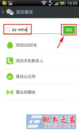 2)进入添加朋友界面,在搜索框内输入sz-ems后,点击“搜索”按键,在搜索成功后,按“关注”按键。(如下图所示)