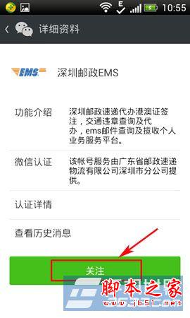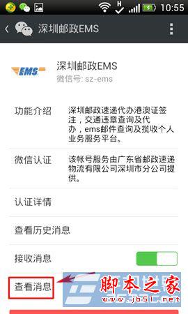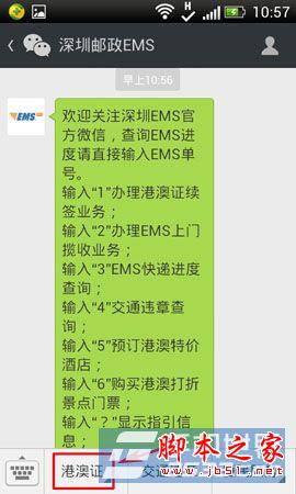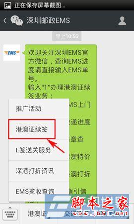 3)在关注成功后,点击“查看消息”按键,在进入深圳邮政EMS界面后,按“港澳证”按键。(如下图所示)