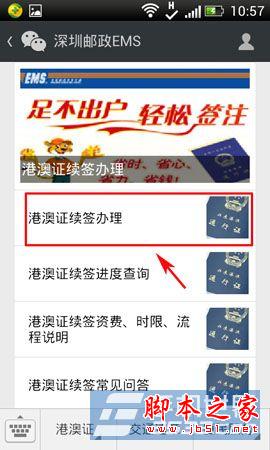 深圳特区报讯 (通讯员 王展雄 记者 王蕊)市民办理港澳通行证签注又多了一个便捷渠道。近日,深圳邮政EMS首推微信办理港澳通行证签注便民服务,在其微信公共账号(sz-ems)上提供港澳通行证续签服务,市民只要动一动手指,便可通过手机办理港澳通行证签注,再也不用到出入境大厅排长队了。