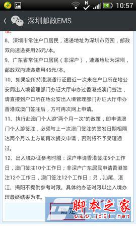 据了解,深圳邮政EMS是国内首家应用微信功能提供办理港澳通行证续签服务的服务商。此外,在深圳邮政EMS微信平台,除代办港澳通行证签注外,还可办理交通违章业务查询及代办EMS邮件查询、揽收下单等业务。