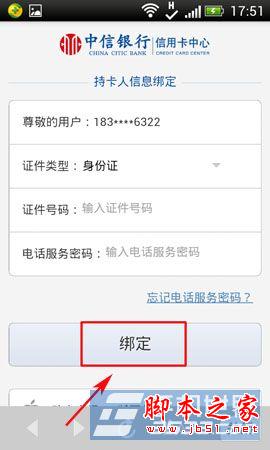 2)在进入中信银行信用卡界面,点击“添加银行卡”按键,在进入添加银行卡界面,输入相关信息后,按“绑定”按键即可。(如下图所示)