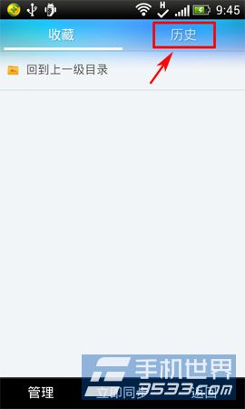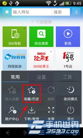 2)在显示出的界面中点击“收藏”按键,进入收藏界面后,按“历史”按键。