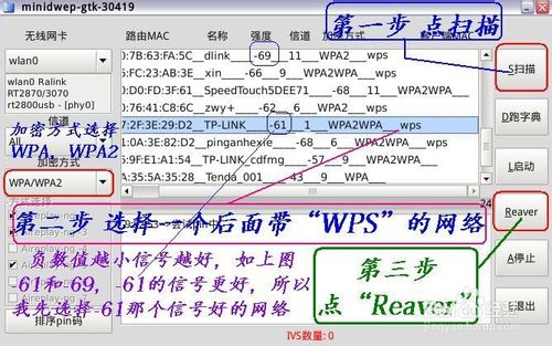 选择WAP/WAP2点扫描,出现如上图扫描网络信号-----选择一个网络信号较好的(负数值小的信号更好,比如上图中 -69和-74,-69的信号更好)后面带“WPS”的网络,点reaver-后再点“OK”开始PIN密码