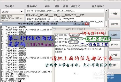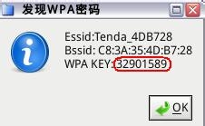 破解成功了 记下路由器的名字(AP SSID后面的) 第二行WPA PSK:后面的就是密码(如密码中带有字母的请注字母的大小写,不要忽略这点) 退出破解系统,找到解过的wif无线路由输入密码就行了