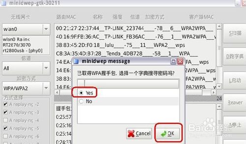 成功抓到“握手包”,选“Yes”点“OK”选择U盘里的字典跑