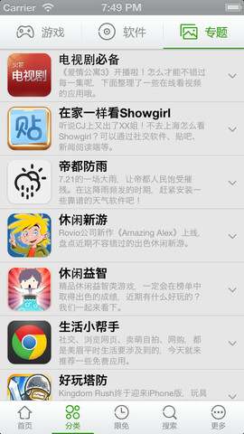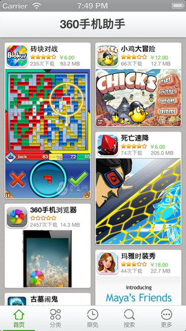 360手机助手iPhone版是一款最全面、最好用的苹果应用推荐软件。实时更新,以精品、排行、限免、分类等多种方式为用户推荐有趣实用的软件、游戏等信息,是您苹果爱机的最佳伴侣!