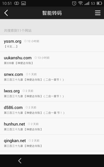 8、在搜索中可搜索你想看的书籍,追书神器会根据你填写的书名在网上寻找,并提供书籍看点,跳转到“智能转码”界面。