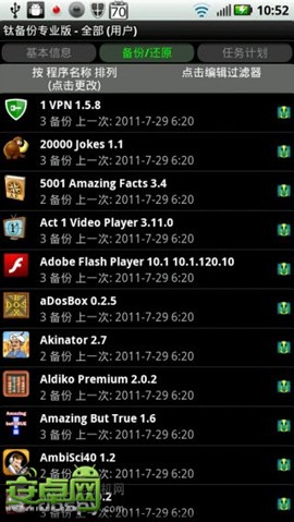 过滤器是钛备份一个相当重要的概念,无论是备份还是还原都需要和它打交道。而这其中最常用的过滤器 ,其一是按类型过滤的“用户”过滤器,勾选并点击应用后程序列表里便只显示第三方软件: