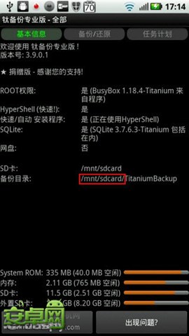接着按返回键(手机底部四大金刚中的那个返回键)按钮逐层回退,然后选择sdcard- ext/TitaniumBackup即可(没有TitaniumBackup文件夹的请自行创建一个):